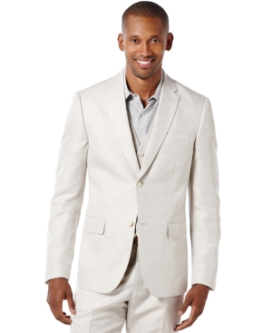 The perfect addition to your sophisticated look, this handsome (and comfortable) suit jacket from Perry Ellis pairs seamlessly with the matching vest and pants.